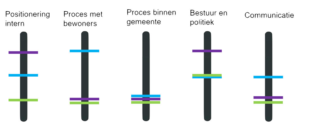 De tweede categorie is het proces met bewoners. Een schuif bovenaan betekent dat er op een structurele manier wordt omgegaan met bewonersinitiatieven en/of lokale democratie. Zo plaatst de gemeente Schiedam de schuif bovenaan omdat zij veel instrumenten beschikbaar hebben voor initiatieven en bewoners veel gestimuleerd worden tot initiatief. Een schuif onderaan betekent dat er per situatie wordt bekeken hoe dit het beste opgepakt kan worden in de organisatie. In de gemeente Altena merken ze bijvoorbeeld dat signalen van bewoners breed in de organisatie binnenkomen. Dit kan ervoor zorgen dat iedereen zich verantwoordelijk voelt voor burgerinitiatieven maar het risico is versplintering. In alle drie de gemeenten is een budget beschikbaar voor initiatieven.